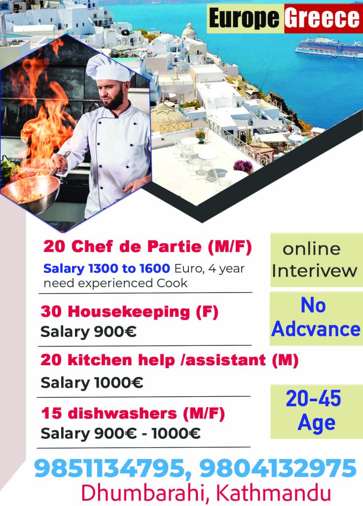 Chefs, Cook (Continental, European), Baker, Pastry Chefs, Sous Chefs, Sushi Chefs, Kitchen Helpers, Cook Helpers, Waiters/Waitressess, Baristas, Bartenders, Housekeepers, Cleaners, Laundry Staff, Security Guards,