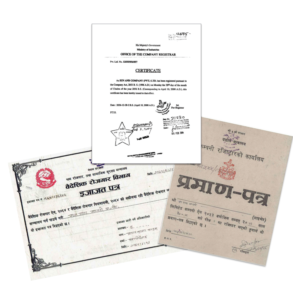 Sun & Company Pvt. Ltd One of the reputed and leading recruitment agencies in Nepal, established in 2004 under the Company Act 2053 B.S.(1996 A.D.) of Nepal Government Registration No. 12555/056/057 and Department of Foreign Employment (164/056/057. We are a globally certified agency with recognition from Responsible Business Alliance and ISO 9001: 2009 and follow world class sustainable recruitment practices.